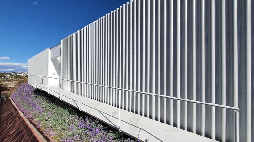 The façade, through the use of the corrugated profile, creates a changing play of light and shadow throughout the day, giving the building a vibrant character despite its static appearance.
