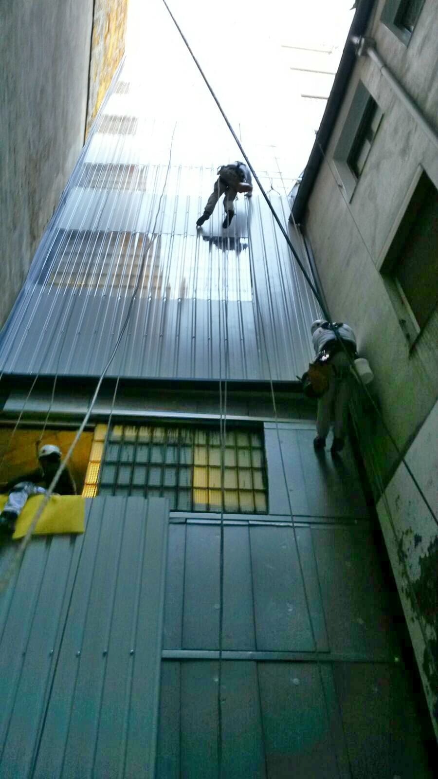 The façade solution is made up of the outer sheet using the INCO 30.5 profile arranged vertically, rock wool thermal insulation and spacer omegas arranged horizontally. This INCO 30.5 ribbed profile combined with the INCO 30.5 profile in transparent compact polycarbonate for the solution of holes, gives an avant-garde and innovative finish to this building from the 60s.