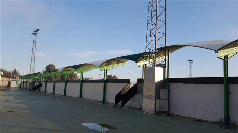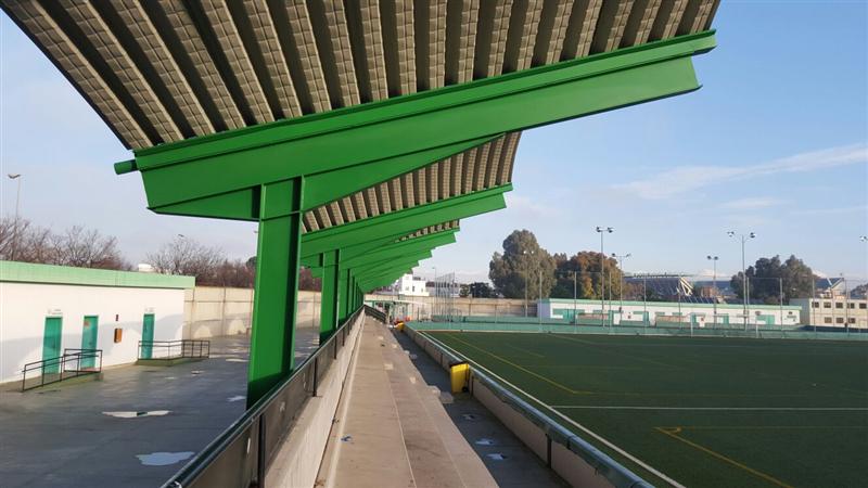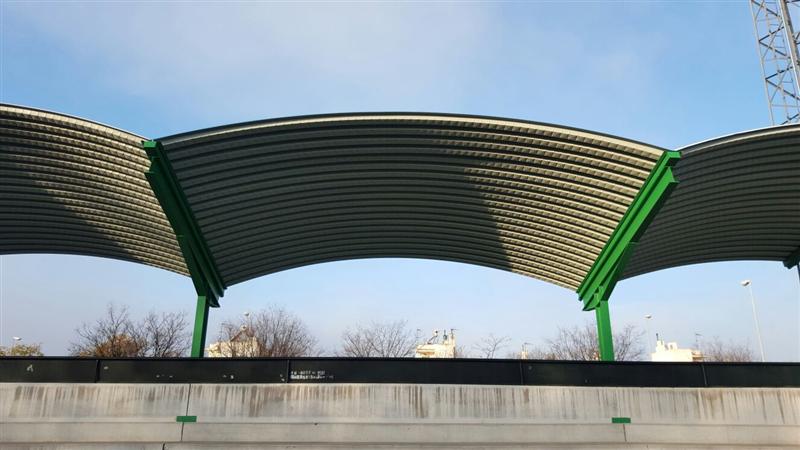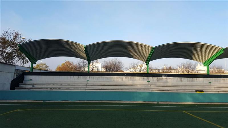 The curved roof solution has been used for the construction of the canopy for the stands of the Luis del Sol sports city stadium in Seville. The roof has been arranged on the left side of the training field on a metallic structure formed by a set of pillars with a cantilever beam.