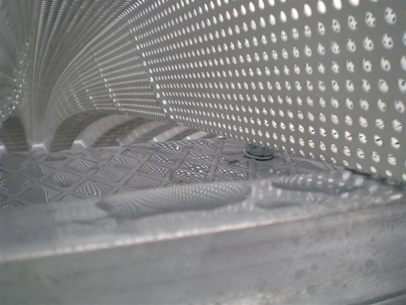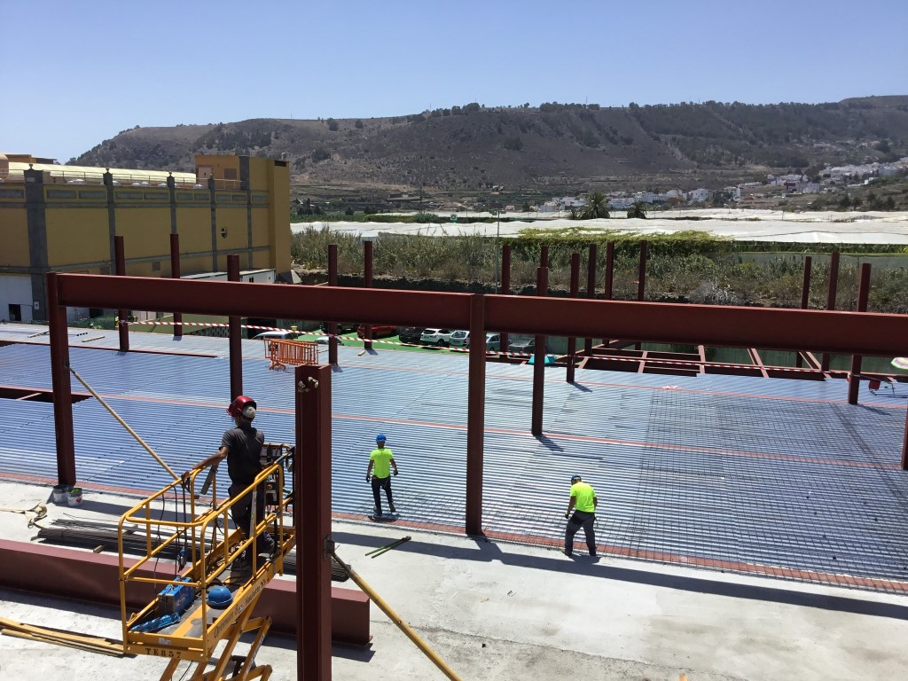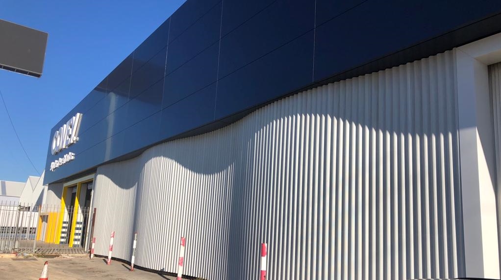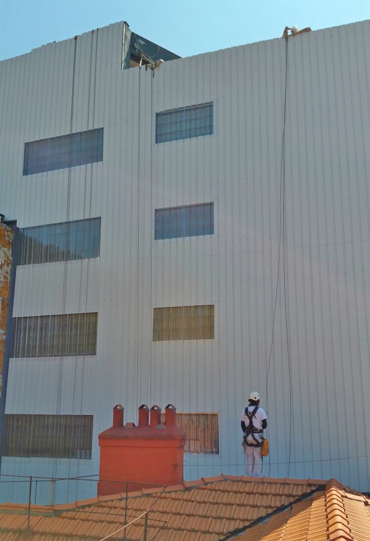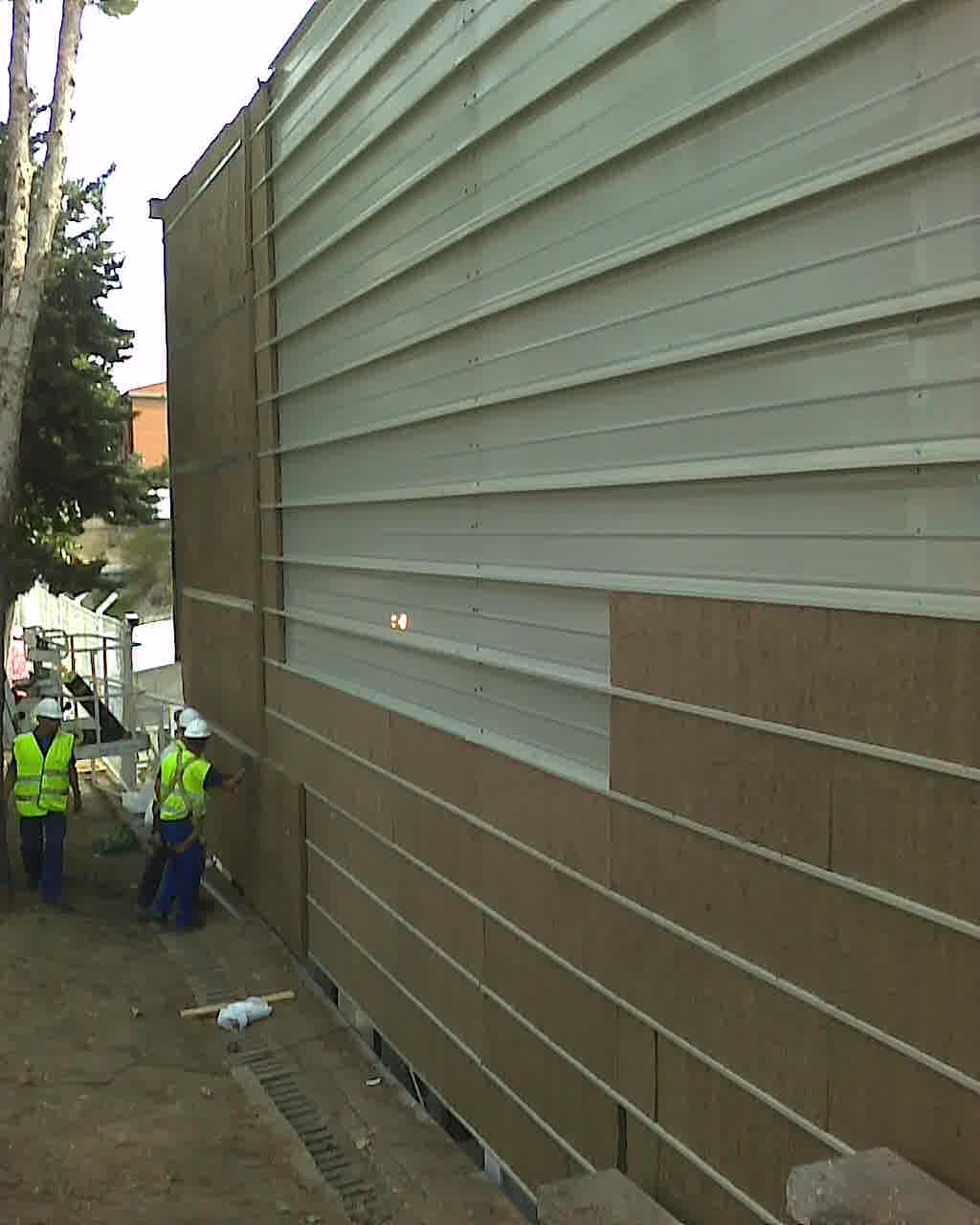 Le système est composée par des cadres métalliques fixés sur les dalles du plancher, ils sont disposés à mode de lames verticales au long de toute l’hauteur du bâtiment. Le profil INCO 44.6 Ondulé micro perforée an acier cor-ten couvre les deux faces des cadres avec l’intention de tamiser la lumière vers l’intérieur. Ce mécanisme de control solaire empêche, en fonction de l’heure, l’entrée de la radiation directe au bâtiment.