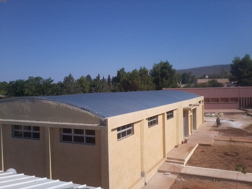 Couverture Cintrée Légère Autoportante Sandwich pour couvrir une partie de l’institut supérieur étatique de l’école de mines d’Oujda, Maroc. La couverture, est installée sur une structure en béton, parvient à couvrir une distance libre de 12 mètres.