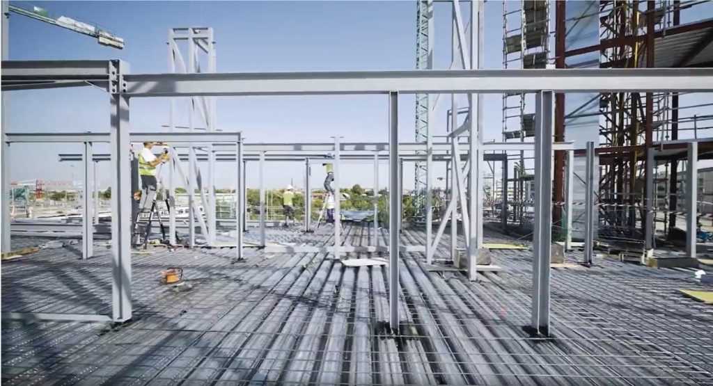 Construction industrialisée utilisant le système de steel frame d’ossature et du plancher collaborant en acier INCO 100.3, avec des portée libre de 4 m et REI90 sans besoin d’étayage