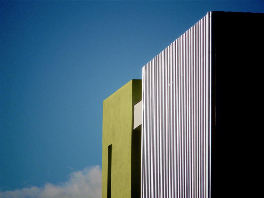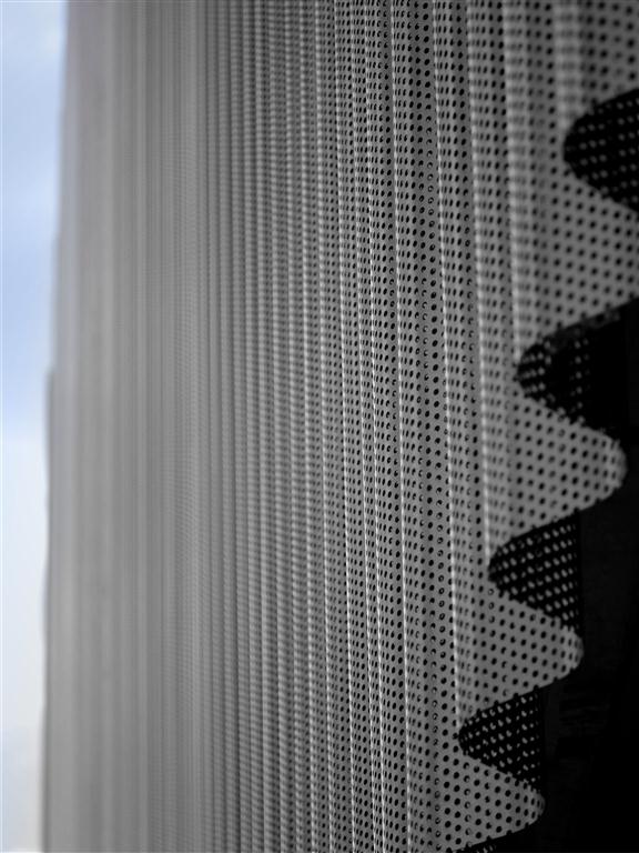 En ce cas, le type de perforé utilisé permet que des l’extérieur l’aspect soit opaque, tandis que des l’intérieur la peau perforé disparait, en donnant un aspect totalement translucide. (voir photo). D’autre part, à mesure que le soleil se couche les vides de la façade commencent à se percevoir et, l’aspect se transforme.