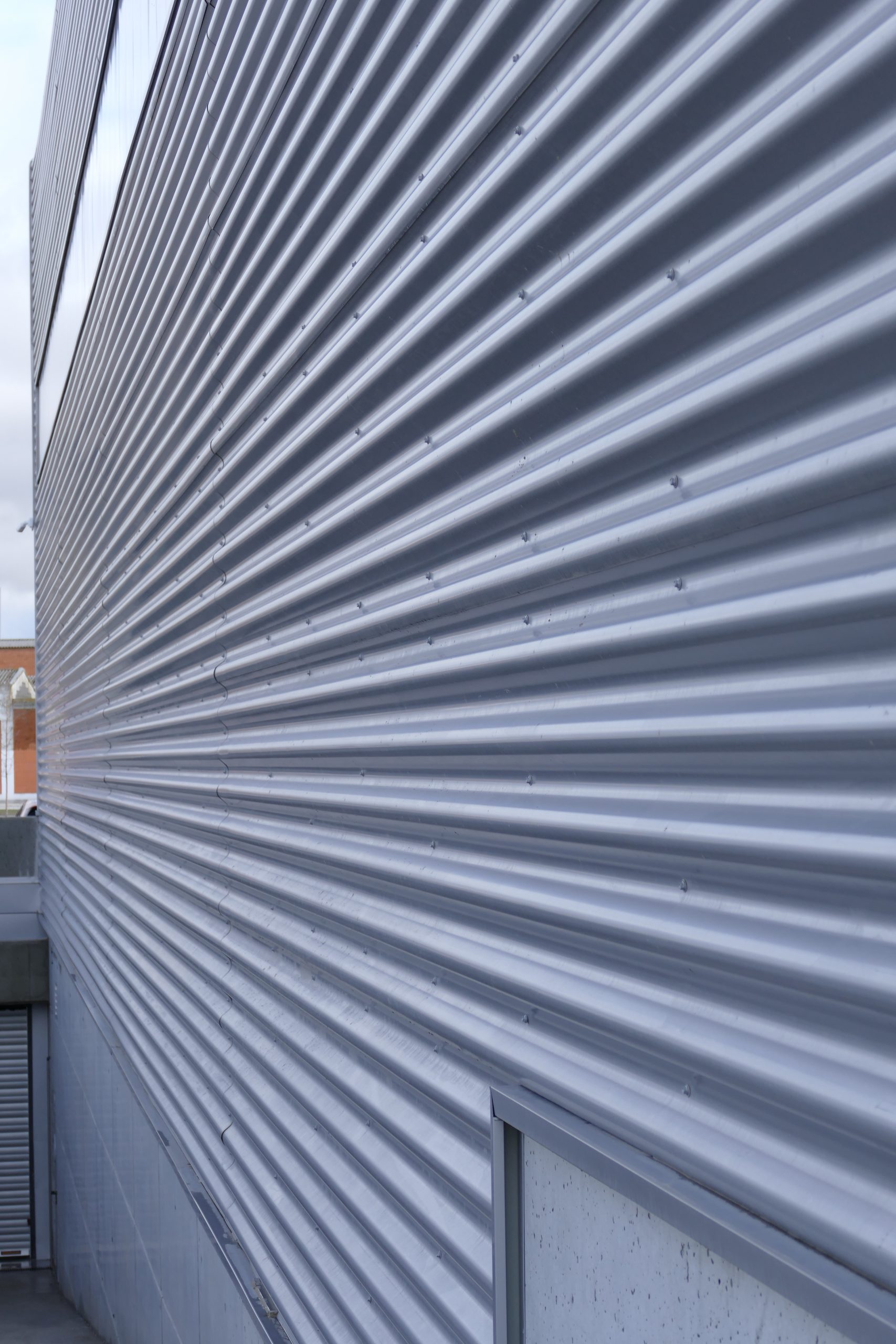 À cette occasion, le bac acier ondulé INCO 44.6 a été utilisé pour le système de façade sandwich, installé horizontalement et dans une finition en acier galvanisé et prélaqué de 25 microns en RAL 9006 Silver Metallic.