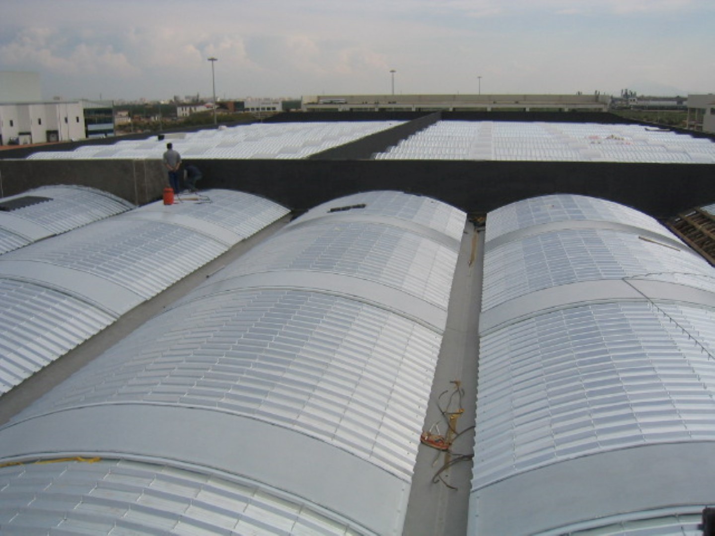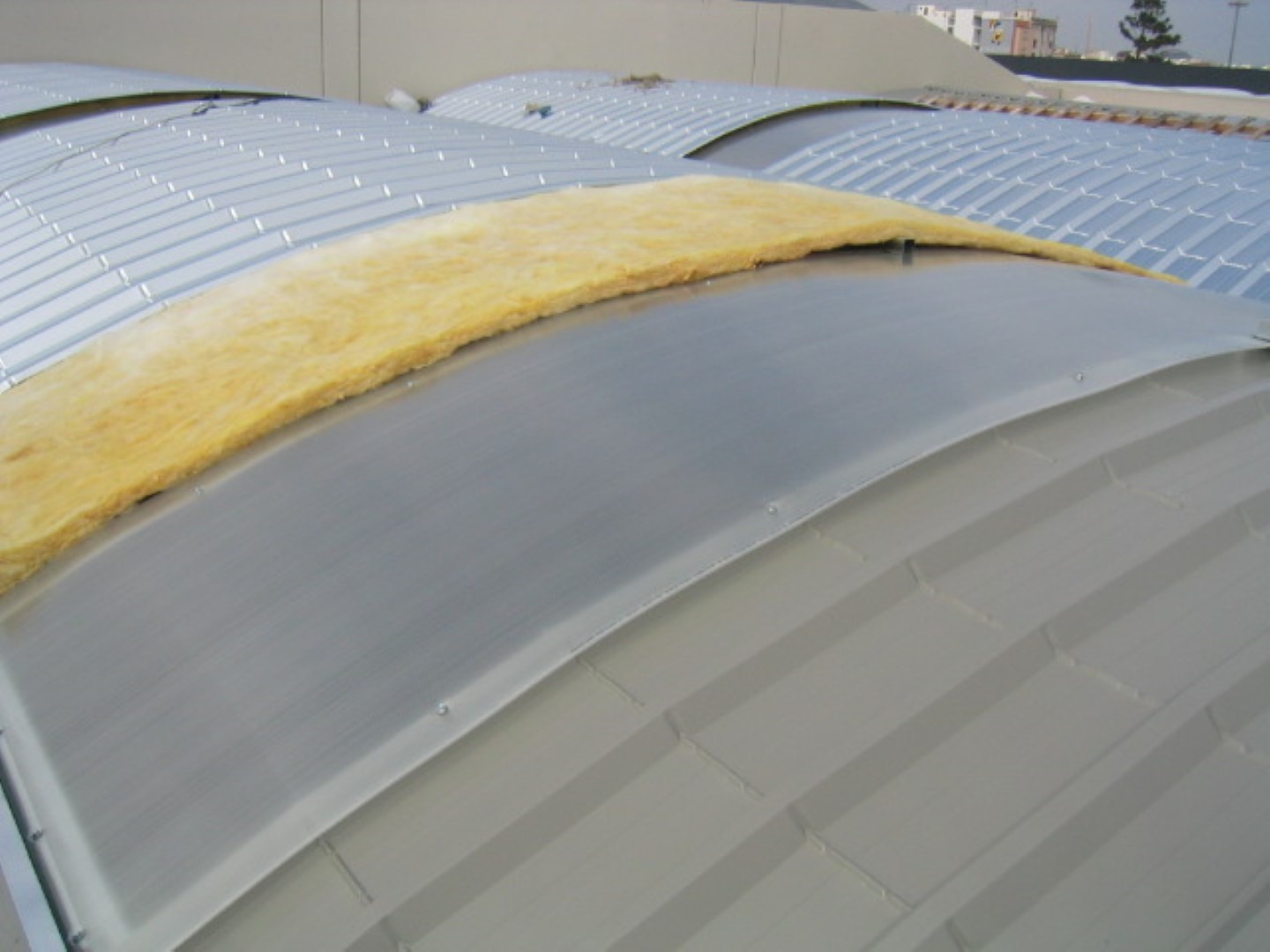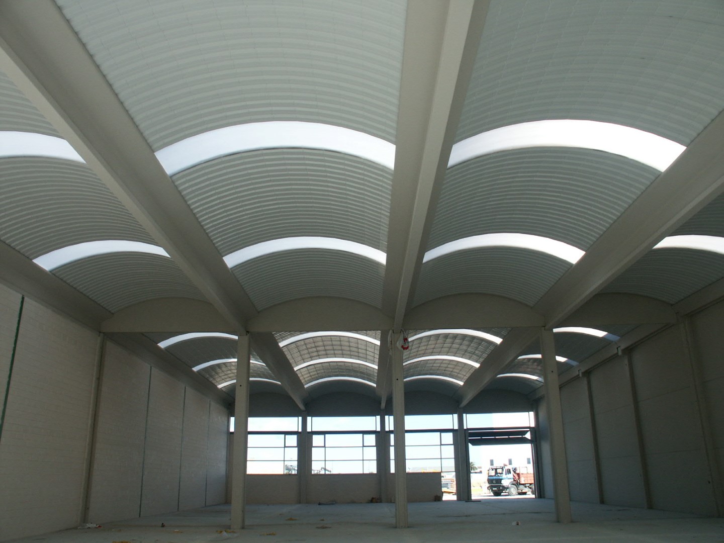 Cloison sandwich de couverture autoportante profilé INCO 44.4 Cintré. Ce profil peut couvrir une distance jusqu’au 6 mètres sans une structure. Il est installé sur les poutres préfabriquées en béton. Les lucarnes de polycarbonate cellulaire lisse se fixent aux planchers métalliques avec de profilés étanches.