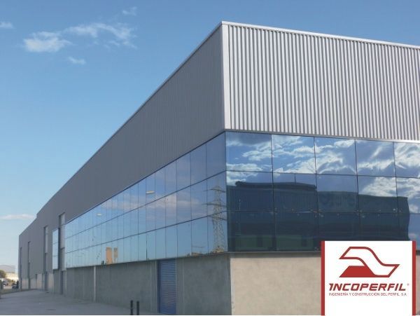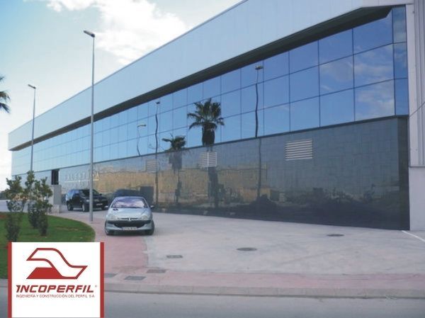 Façades formées par le profil architectonique INCO 44.6 ONDULÉ, où la couleur Ral 9006 métallisé se combine avec la cloison en verre. La closion de la couverture est constituée par un profil standard galvanisé.