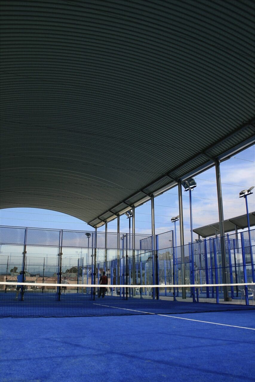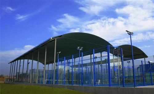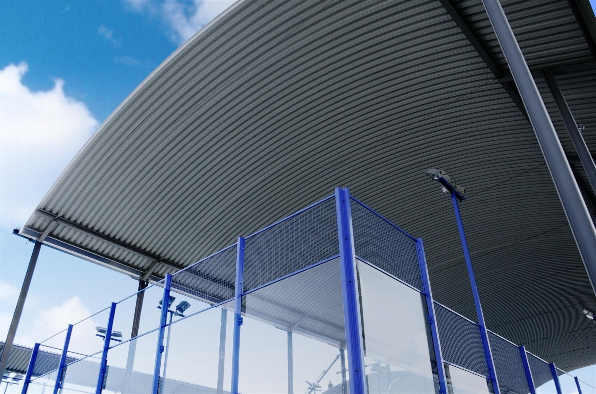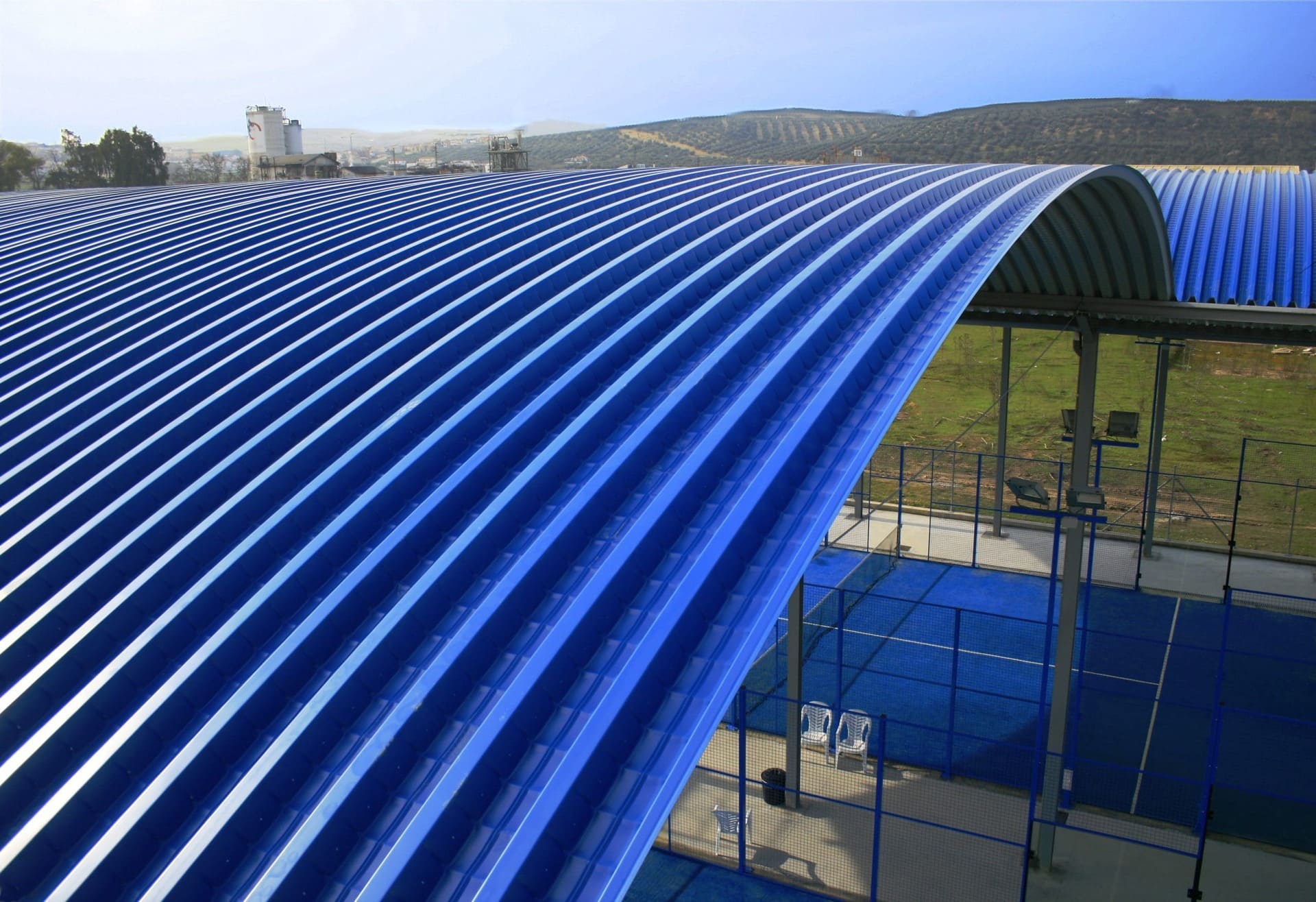 Cubierta Curvada Autoportante para cubrir cuatro pistas de pádel mediante el perfil INCO 70.4 Curvado. La distancia libre entre los soportes de la cubierta es de 16 metros, por lo tanto se planteó una solución de ménsulas a cada lado de la línea de pilares para recibir el perfil INCO 70.4 Curvado (hasta 13,30m).