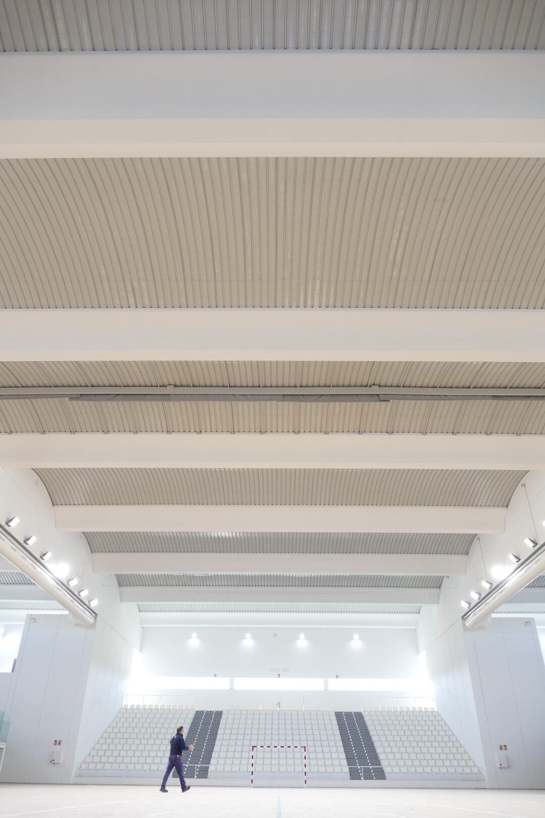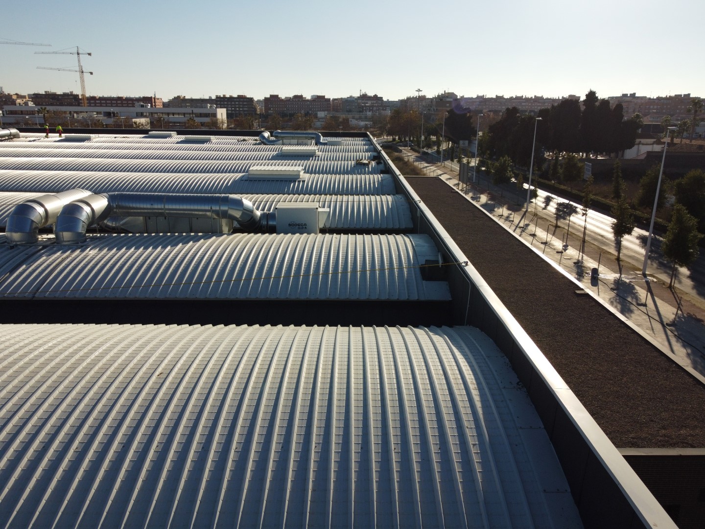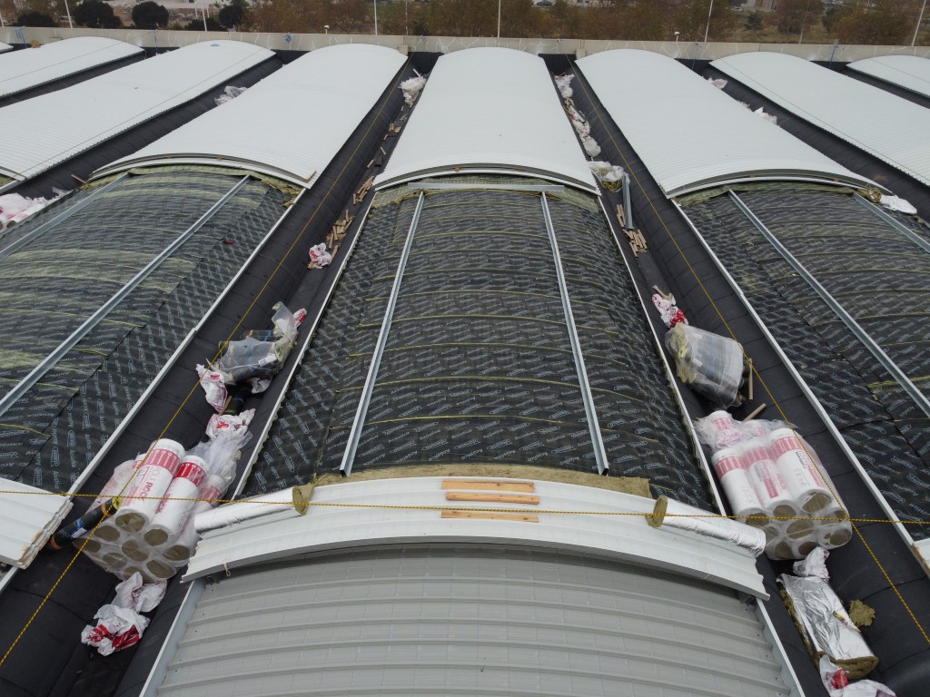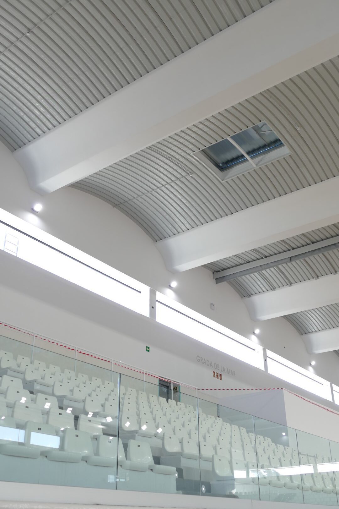 El cerramiento de cubierta ha contado con el sistema de cubierta curvada autoportante multicapa y ha sido ejecutado con perfiles curvados de Incoperfil. La solución está compuesta por el perfil INCO 44.4 Curvado Perforado R3-T6 en la capa inferior para asegurar un buen confort acústico, sobre que que se dispone el aislamiento termoacústico.