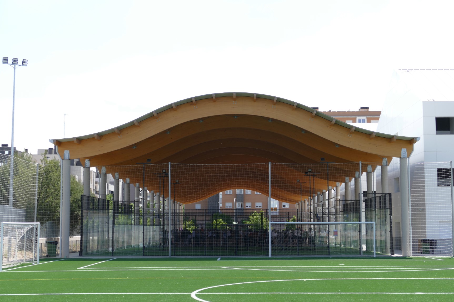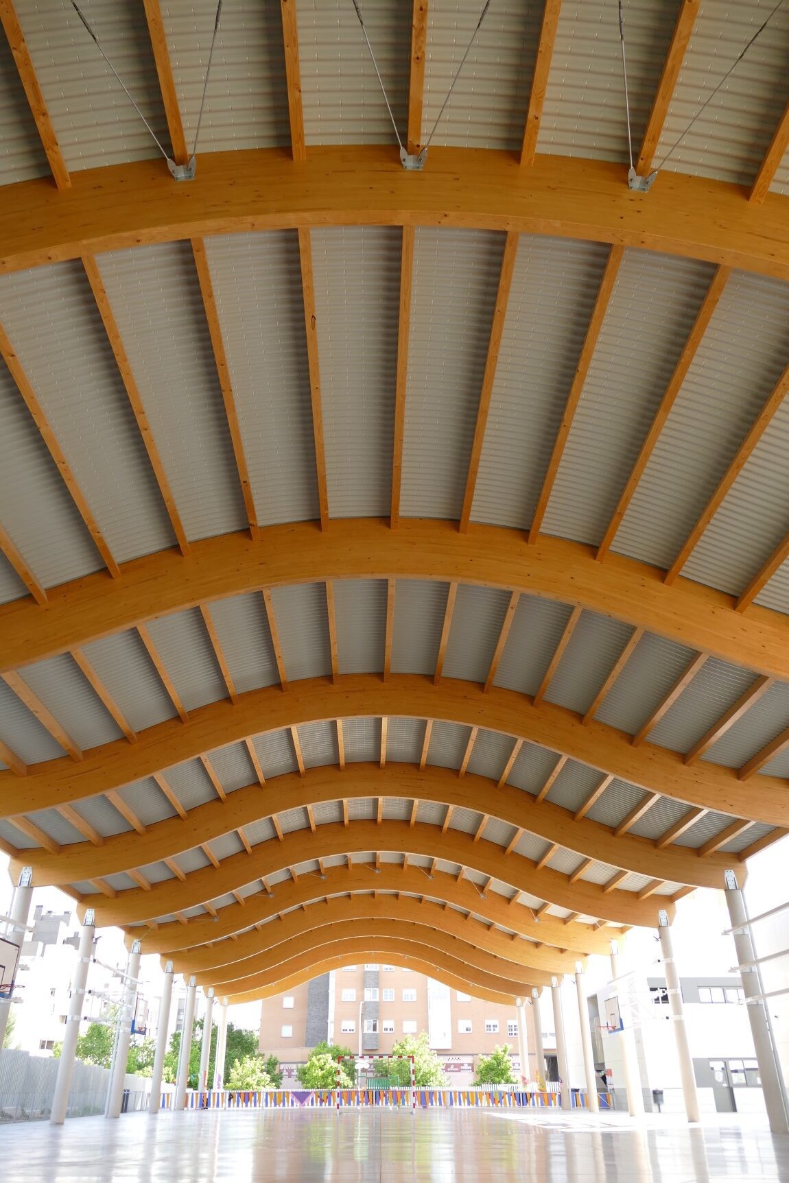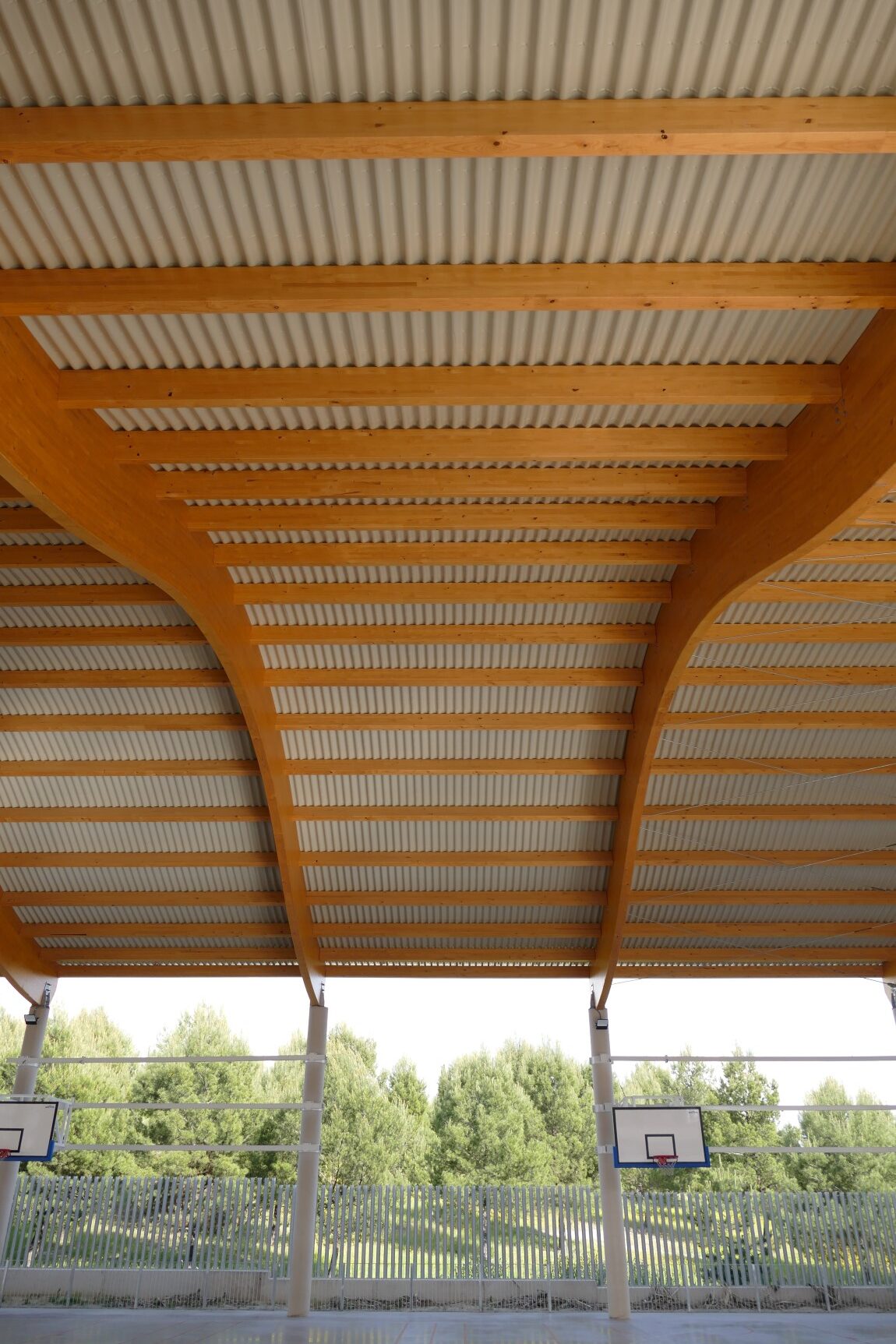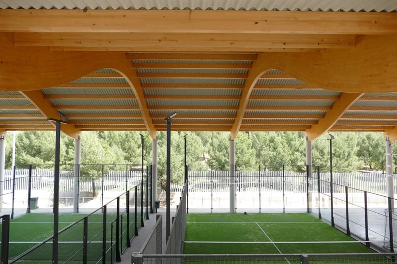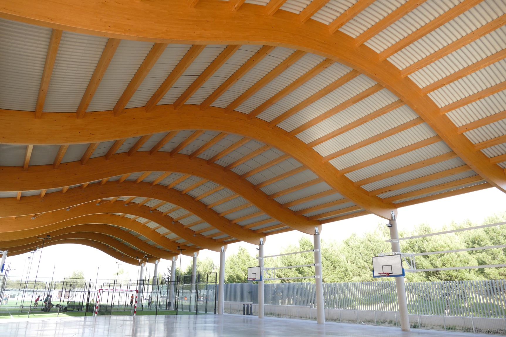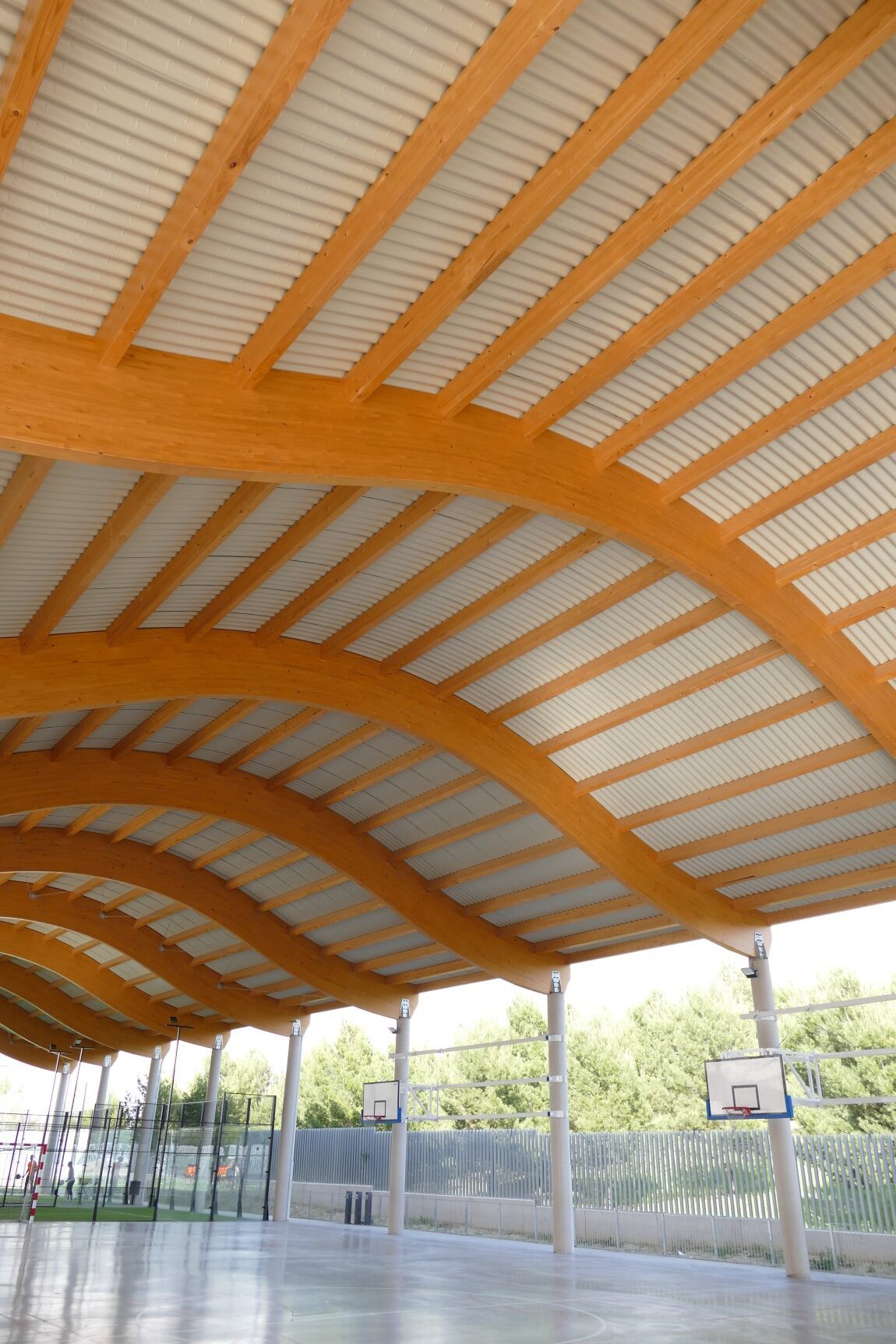 A estos espacios se suman pistas deportivas con un área cubierta que abarca las pistas de baloncesto y pádel. Esta última zona cuenta con una cubierta diseñada con celosías de madera y un cerramiento metálico compuesto por el perfil INCO 44.6 Ondulado. Gracias a la simetría de este perfil, es posible su instalación en cubiertas que combinan formas cóncavas y convexas.