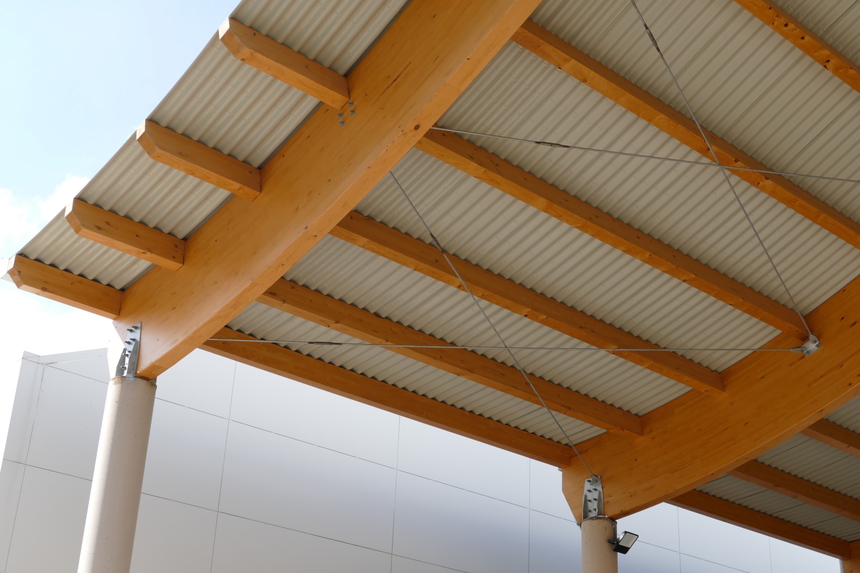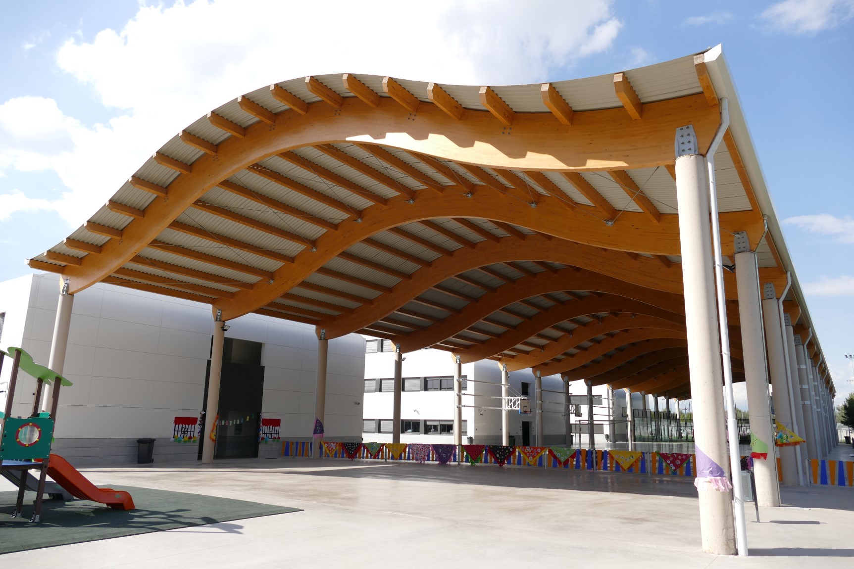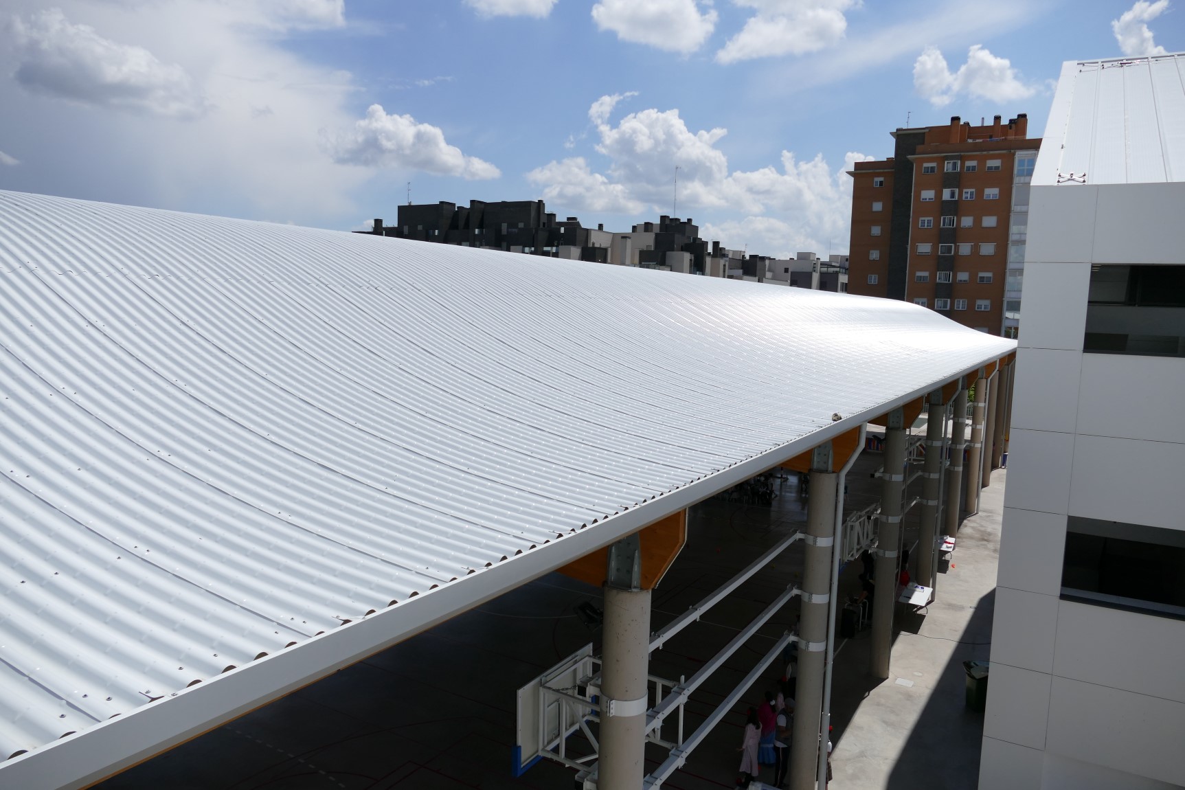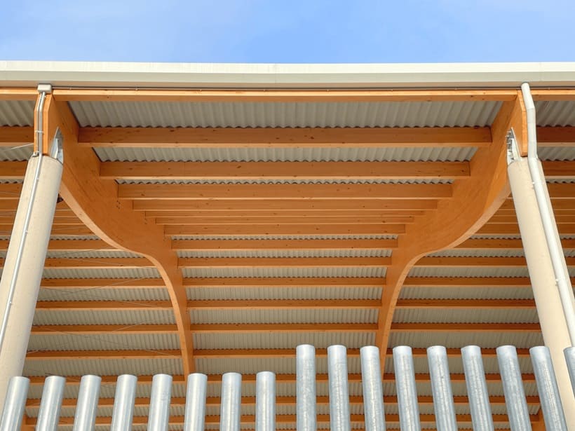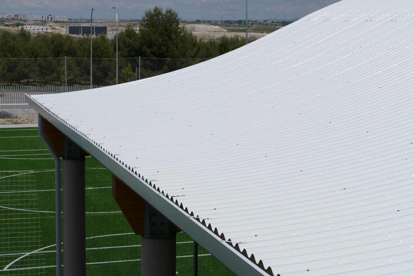 A estos espacios se suman pistas deportivas con un área cubierta que abarca las pistas de baloncesto y pádel. Esta última zona cuenta con una cubierta diseñada con celosías de madera y un cerramiento metálico compuesto por el perfil INCO 44.6 Ondulado. Gracias a la simetría de este perfil, es posible su instalación en cubiertas que combinan formas cóncavas y convexas.