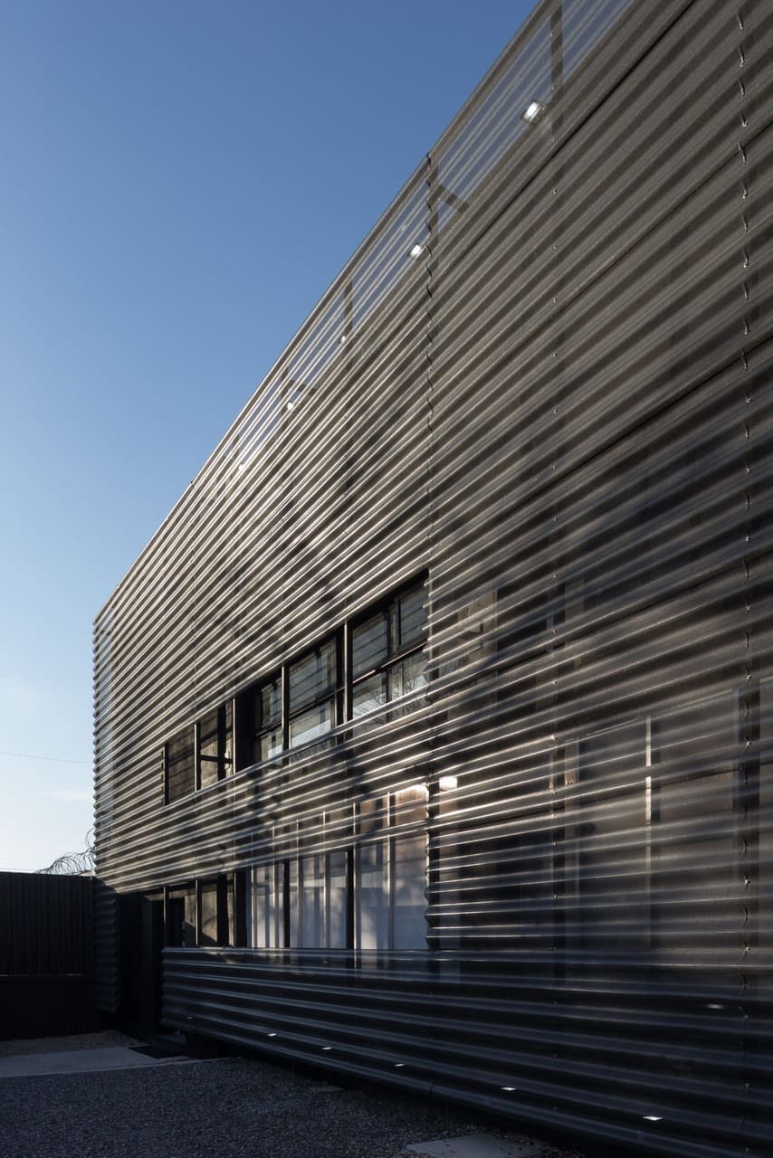 Su imagen exterior se configura a partir del el perfil INCO 44.6 curvado microperforado en color RAL 7024 que se plantea como un sistema de fachada industrial y control solar. Esta envolvente confiere a la fachada un aspecto unitario, ocultando las trazas de la fachada original, y permitiendo la iluminación natural del interior a través de las perforaciones.