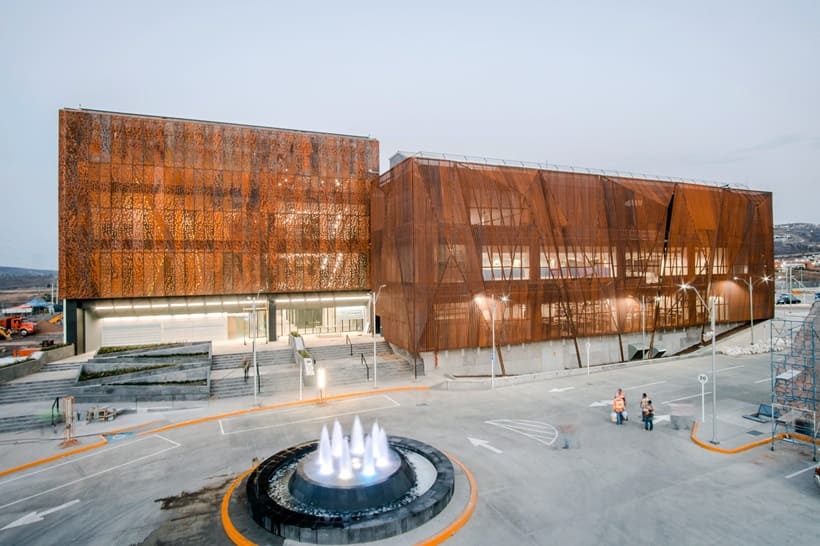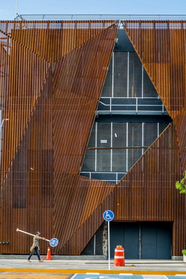 Fachada perforada de acero corten para el Centro Atención Telefónica de Liverpool en Morelia (Michoacán) - México